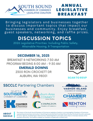 Join us for the South Sound Chambers of Commerce Legislative Coalition’s annual Legislative Breakfast—one of the most impactful opportunities of the year to connect directly with the lawmakers shaping our region’s future. This event brings together legislators, business leaders, and nonprofit partners for meaningful conversations on the issues that matter most to our community.